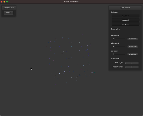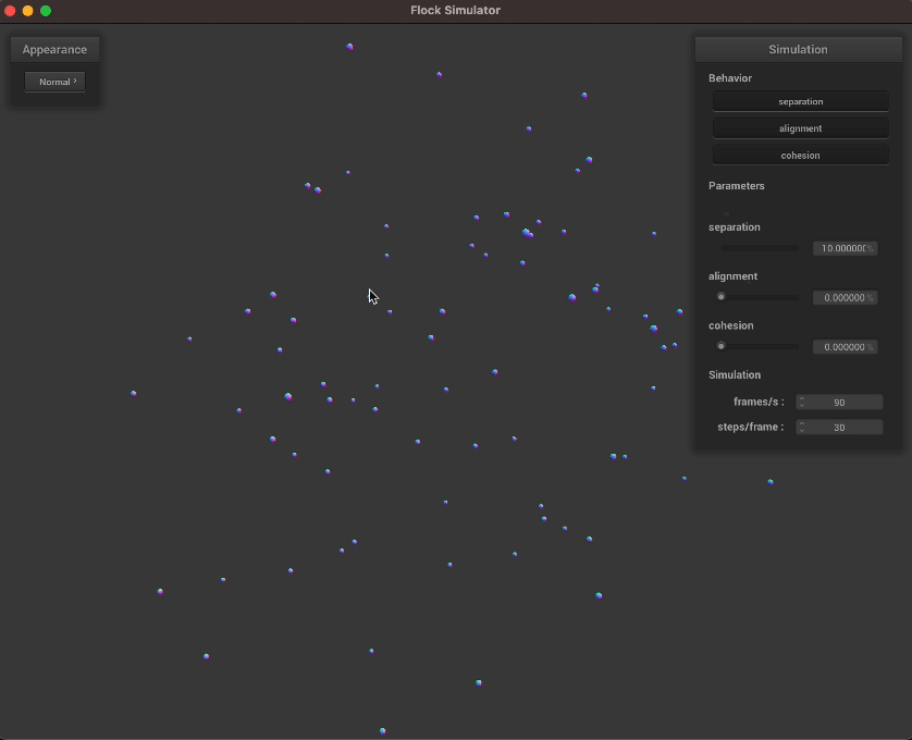 Boids are represented as spheres, with predator Boids being larger. They are contained within a 1x1x1 box and turn smoothly upon hitting a wall. The alignment, cohesion, and separation factors can be adjusted by the user in the GUI, which we adapted from Homework 4.