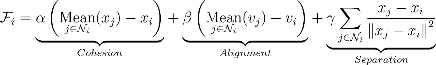 Our Boids have three attributes: position, velocity, and acceleration. We can compute the total force influencing each Boid using the following equation: